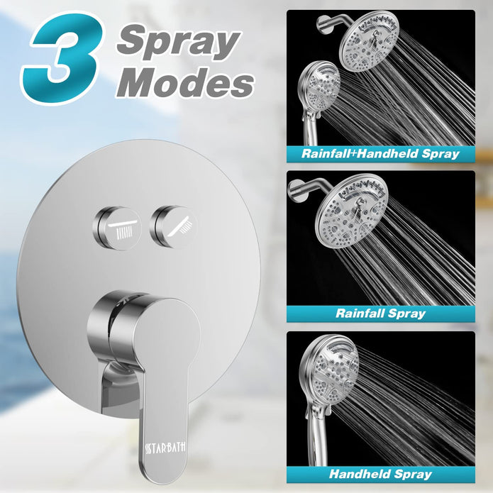 STARBATH 15 functions rain shower system adopts 2022 upgraded water flow technology, multiple spray modes combined with rich water output, Indulge in a luxurious shower. The pearl-like water droplets are dense and delicate, moisturizing every cell of your body.
