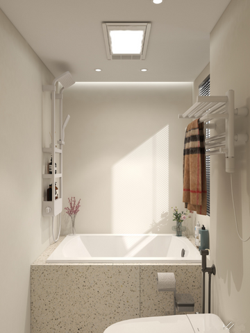 Use the built-in bathtub to reduce the dead corners of hygiene, facilitate the continuous paving of floor tiles, and keep the overall style of the bathroom consistent. The storage area at the bathtub is also used as storage in addition to the small wall by the window and handheld shower head.