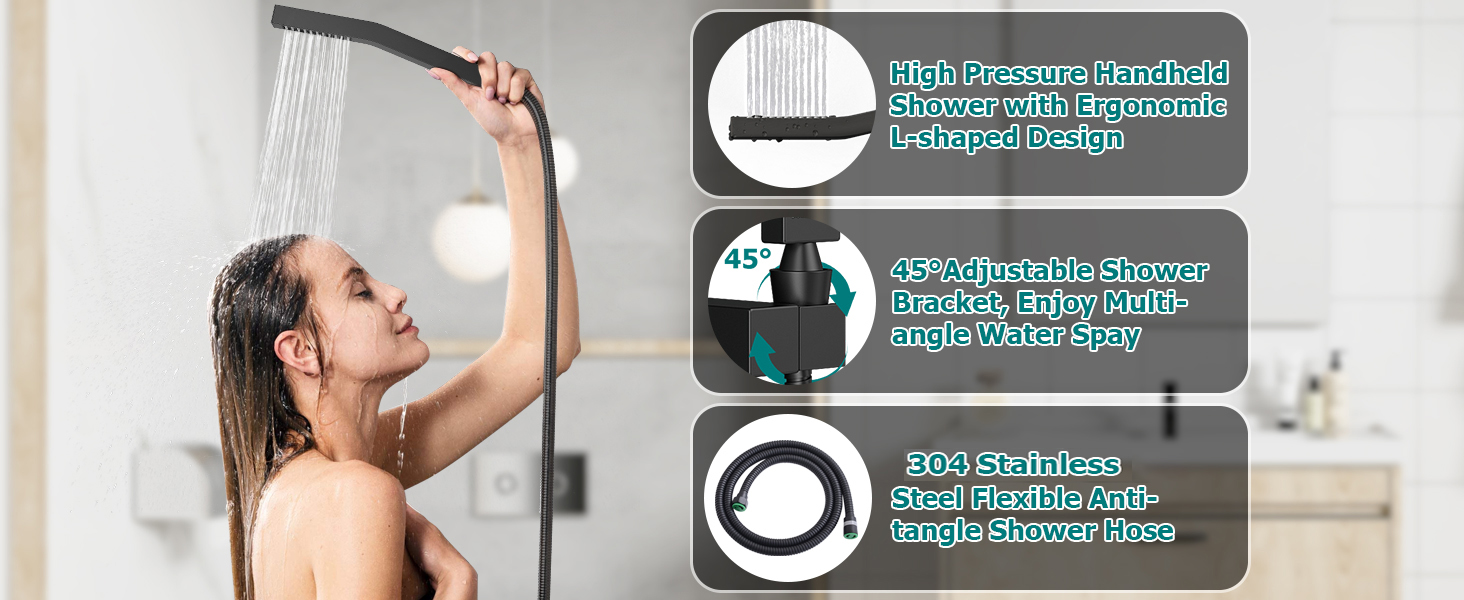 Angle-adjustable Design & All-Metal Style: The rainfall shower head & handheld shower contained in the rain shower system are adjustable, with an extra-long shower tube eliminating blind spots for cleaning. Help you quickly find the soap off your head or face, and also for cleaning your walk-in shower. All-metal construction is more durable than plastic and offers a longer service life, and the design of this shower set will add a little luxury to every day.