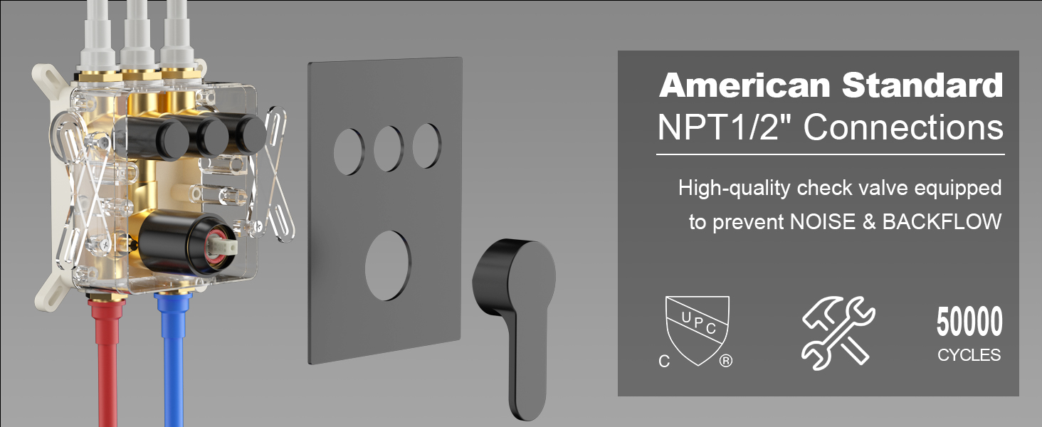 Certified Valve & Reliable Family Protection: Our pressure balance shower valve is cUPC certified and made of high-quality brass, which is the key to the safety of children or the elderly. Will prevent scald and cold water shock, and no sudden temperature changes from toilet flushes, running appliances, or other unforeseen circumstances. And built-in check valve will prevent annoying water hammer problems.