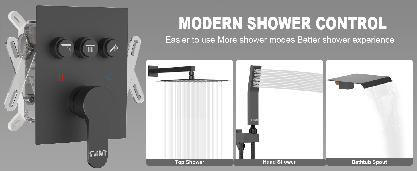 Push Button Diverter & 3 Modes Shower: Our STARBATH wall mounted shower system with tub spout push button matte black replaces the traditional controller with a push-button diverter which allows you to switch effortlessly from rain shower head to handheld spray or bathtub spout with just one click. The new mechanism ensures users don’t accidentally switch to the wrong mode with slippy hands, and you can also use all shower functions together.