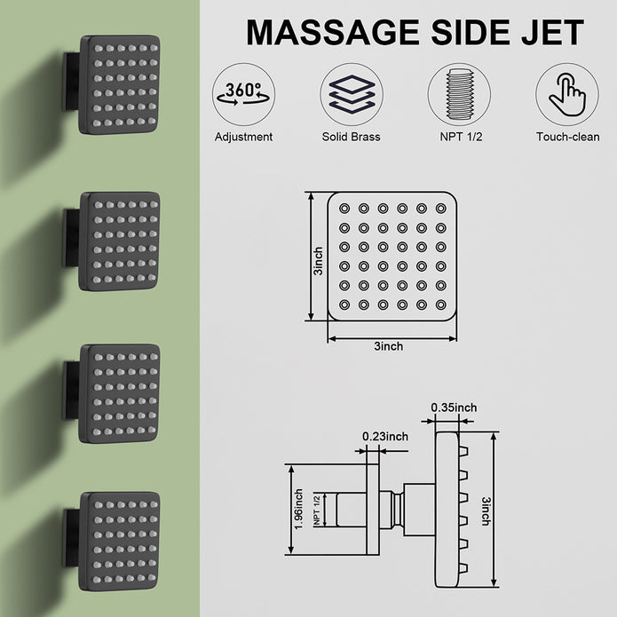 This shower body jet has 36 silicone heads, easy to clean dust, 216 spout holes, bring more water volume. With 360-degree multi-angle adjustment, shower jets can adjust the spray surface.