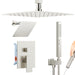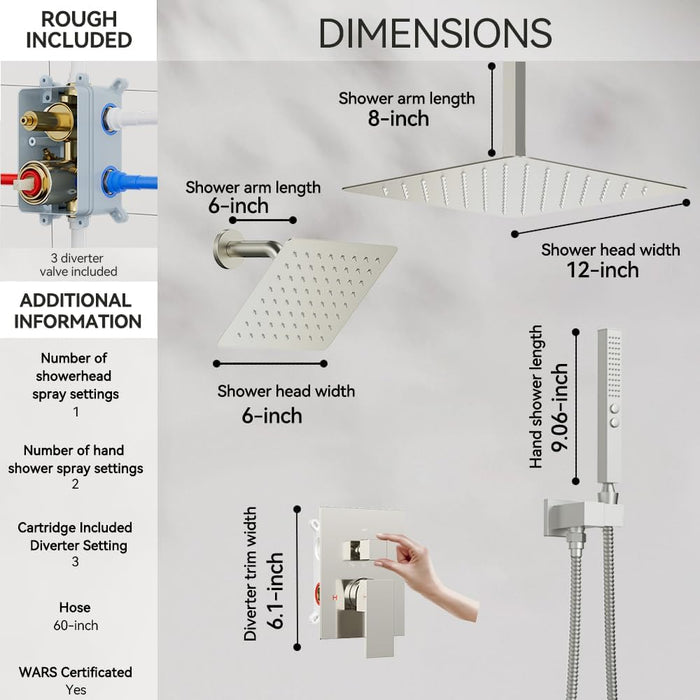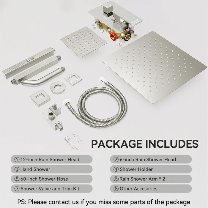 Enjoy the shower time with your Lover: Our multi head shower system includes a 12-inch and 6-inch rain showerhead, along with a water-saving handheld spray, the large shower spray help you showering no more freezing in the corners and no more perilous side-switching.Users have the ability to activate three modes and utilize dual showerheads, including a handheld spray, according to their preferred showering preferences. This innovative feature offers a completely new showering experience.