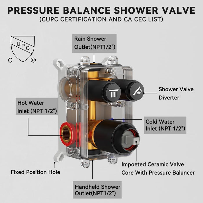 Anti-scalding pressure balancing Valve: Our ceiling mounted shower system adopts an anti-scalding pressure balancing valve and a built-in check valve. The valve can effectively suppress water hammer noise and protect your health by blocking sudden fluctuations in hot and cold water pressure, saving you from potential scalding hazards.