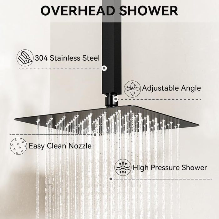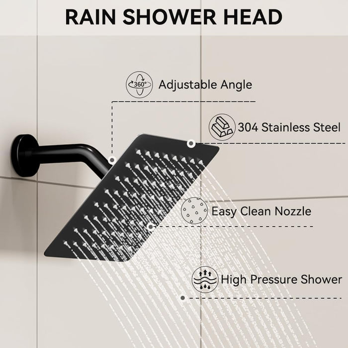 12-inch Rain Shower Head: This rainfall shower head provides a wider coverage area, ensuring that you are completely surrounded by water. You will experience a shower similar to a rejuvenating spa treatment, just like in a gentle and abundant rainfall. The water is evenly dispersed in the head and can be adjusted within a 360-degree range, allowing you to set it to any angle you like.