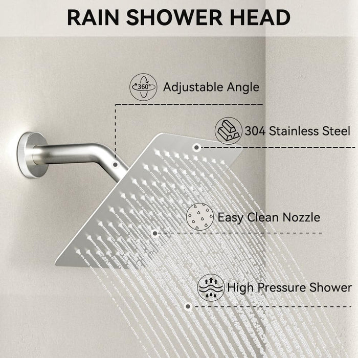 12-inch Rain Shower Head: This rainfall shower head provides a wider coverage area, ensuring that you are completely surrounded by water. You will experience a shower similar to a rejuvenating spa treatment, just like in a gentle and abundant rainfall. The water is evenly dispersed in the head and can be adjusted within a 360-degree range, allowing you to set it to any angle you like.
