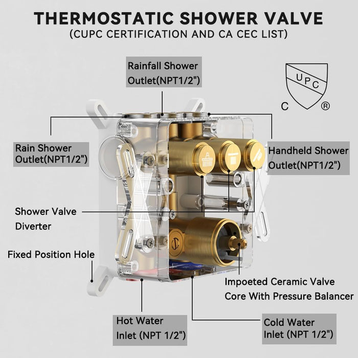 STARBATH Thermostatic Shower System (12+8 Inch) with Two Function Wand Gold