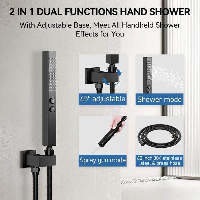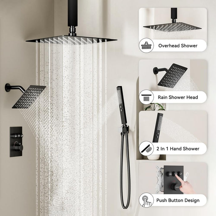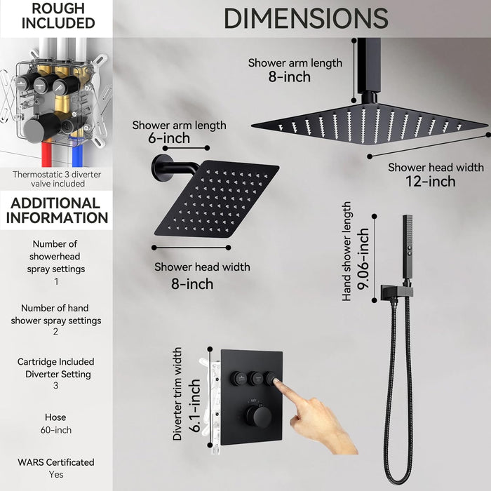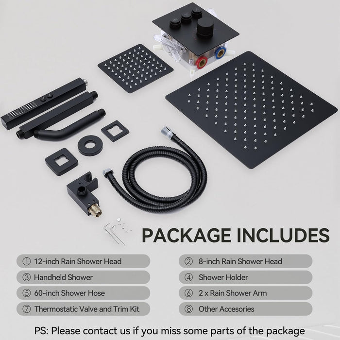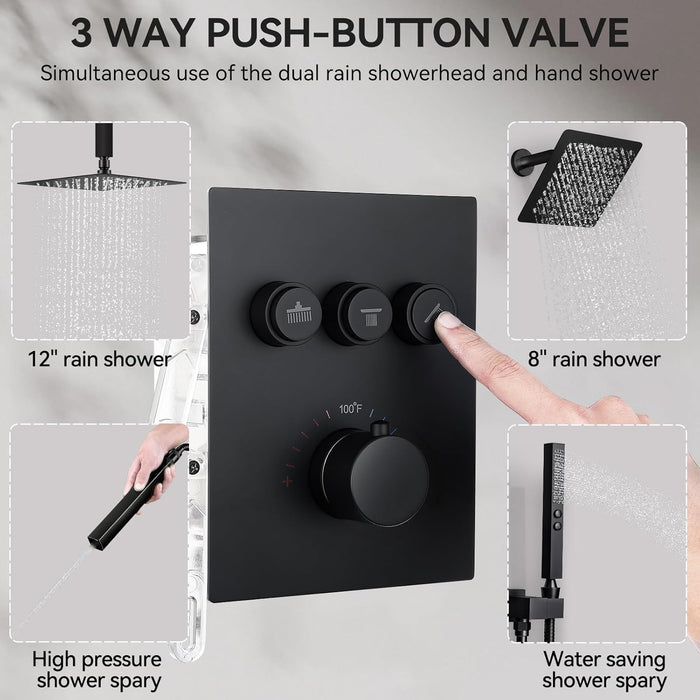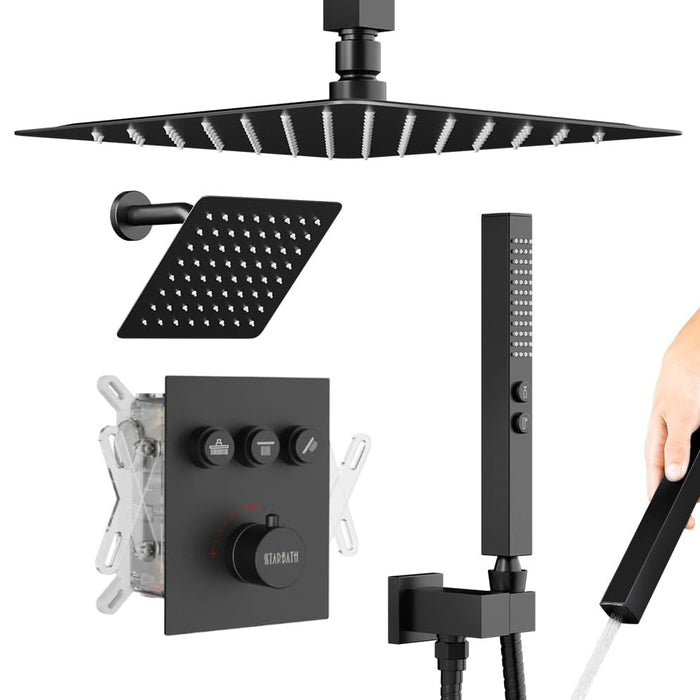 STARBATH Thermostatic Shower System (12+8 Inch) with Two Function Wand Matte Black